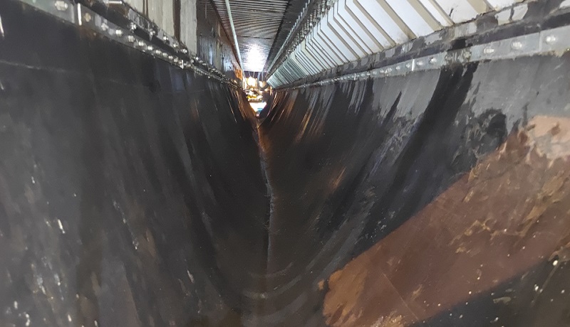 蕪湖長(zhǎng)江三橋主橋0#、5#墩處采用最大伸縮量為1200mm的梳齒形伸縮縫,齒間距約50mm,通過(guò)橡膠止水帶收集雨水后排至兩側(cè)雨水斗進(jìn)入雨水系統(tǒng)。自三橋通車(chē)以來(lái),車(chē)輪及雨水裹挾泥沙由梳齒間隙進(jìn)入伸縮縫,止水帶內(nèi)存有不少泥沙和雜物。隨著時(shí)間的推移,止水帶內(nèi)積沙積泥載荷增大,將會(huì)對(duì)正下方高鐵運(yùn)行產(chǎn)生威脅。為及時(shí)消除安全隱患,大橋公司路產(chǎn)安全部養(yǎng)護(hù)人員組織外協(xié)單位多次前往現(xiàn)場(chǎng)確定清理方案及安全防護(hù)措施,并在公司領(lǐng)導(dǎo)帶領(lǐng)下及時(shí)對(duì)接鐵路蕪湖工務(wù)段,申請(qǐng)高鐵運(yùn)行天窗期開(kāi)展專門(mén)清理工作。